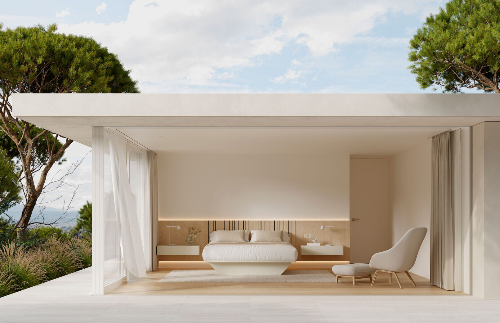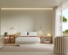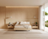 que transmiten mayor amplitud. Armario corredero interior 460 largo 239 alto, Cabezal modelo Frame de 280x80 cm alto, cama bañera con patas aguja de150x190 cm, juegos de mesitas auxiliares Shitake de Ø50x50 cm alto-Ø40x40 cm, mesita de 2 cajones de 60 cm. Colores: Arena -Maya- Terracota-