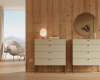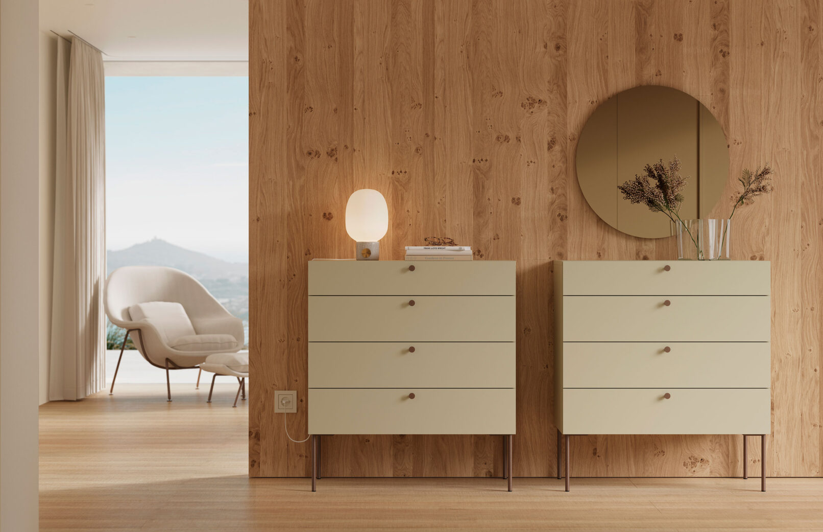 Nueva colección de dormitorios con presencia de materiales naturales y orgánicos como el Roble anudado y el Nogal Americano, chapas nobles que aportan un grado adicional de calidez y también de claidad. La combinación de estas chapas con los lacados mate tacto seda son únicos con un aspecto visual incomparable. Son combinables en cabeceros, módulos mesitas d enoche, cómodas, sinfonieres, ...