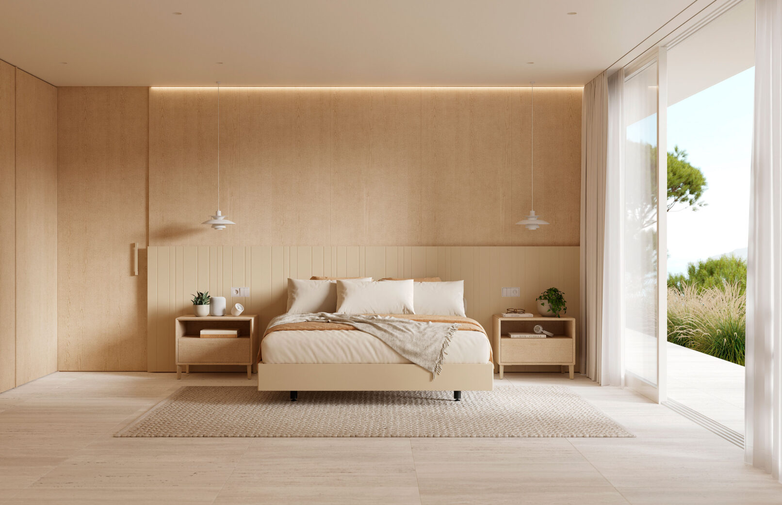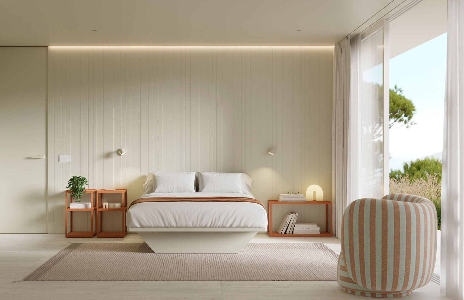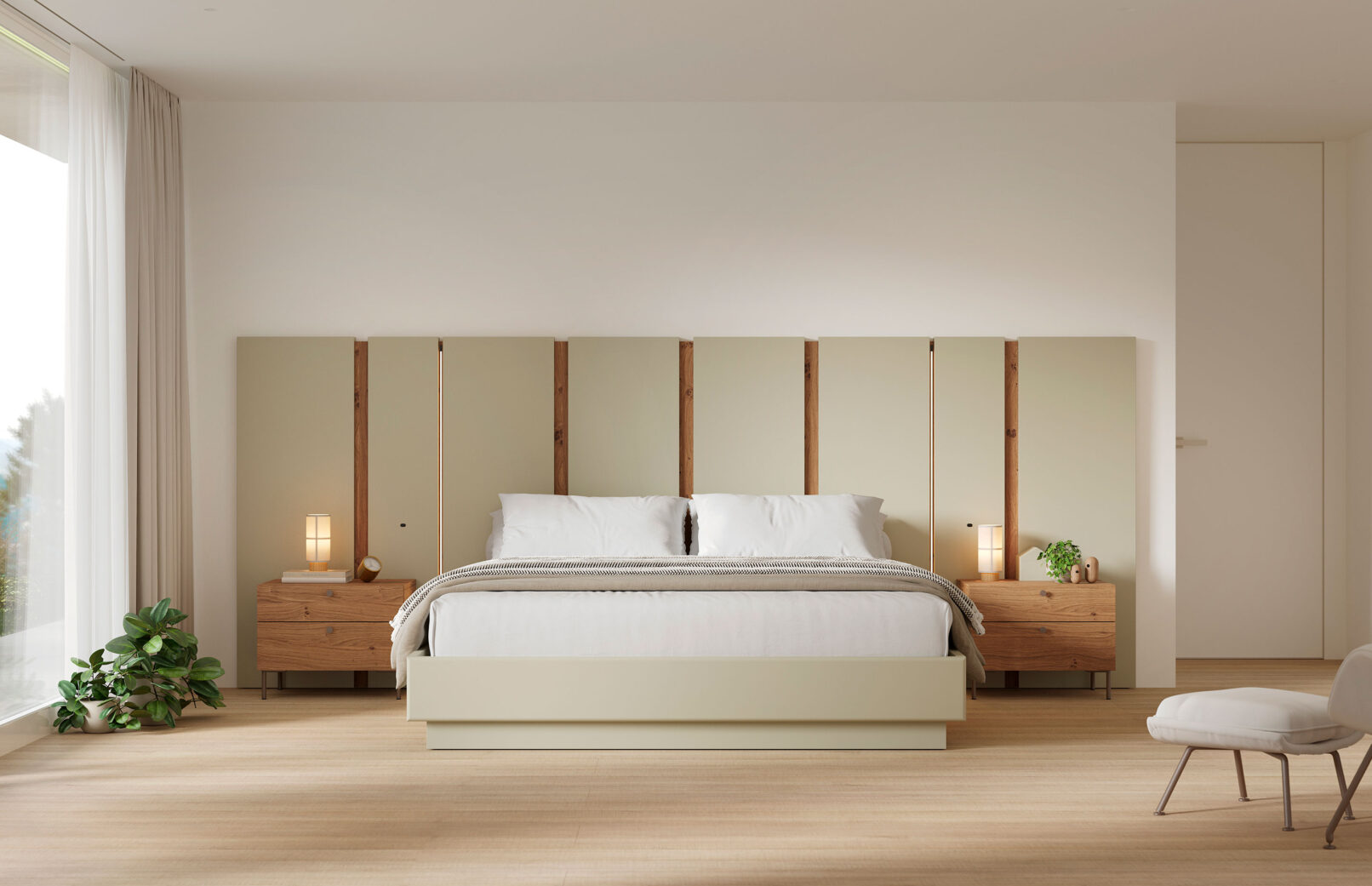 Ambiente Dormitorio en SALVIA | ALMENDRA. Medidas L288 H55+60 cm. Nuevas ideas de composición para estos espacios que merecen un detalle singular, es lo que ofrece el cabezal LISTEL combinado en dos colores y complementado con los módulos RECTO suspendidos a pared.