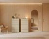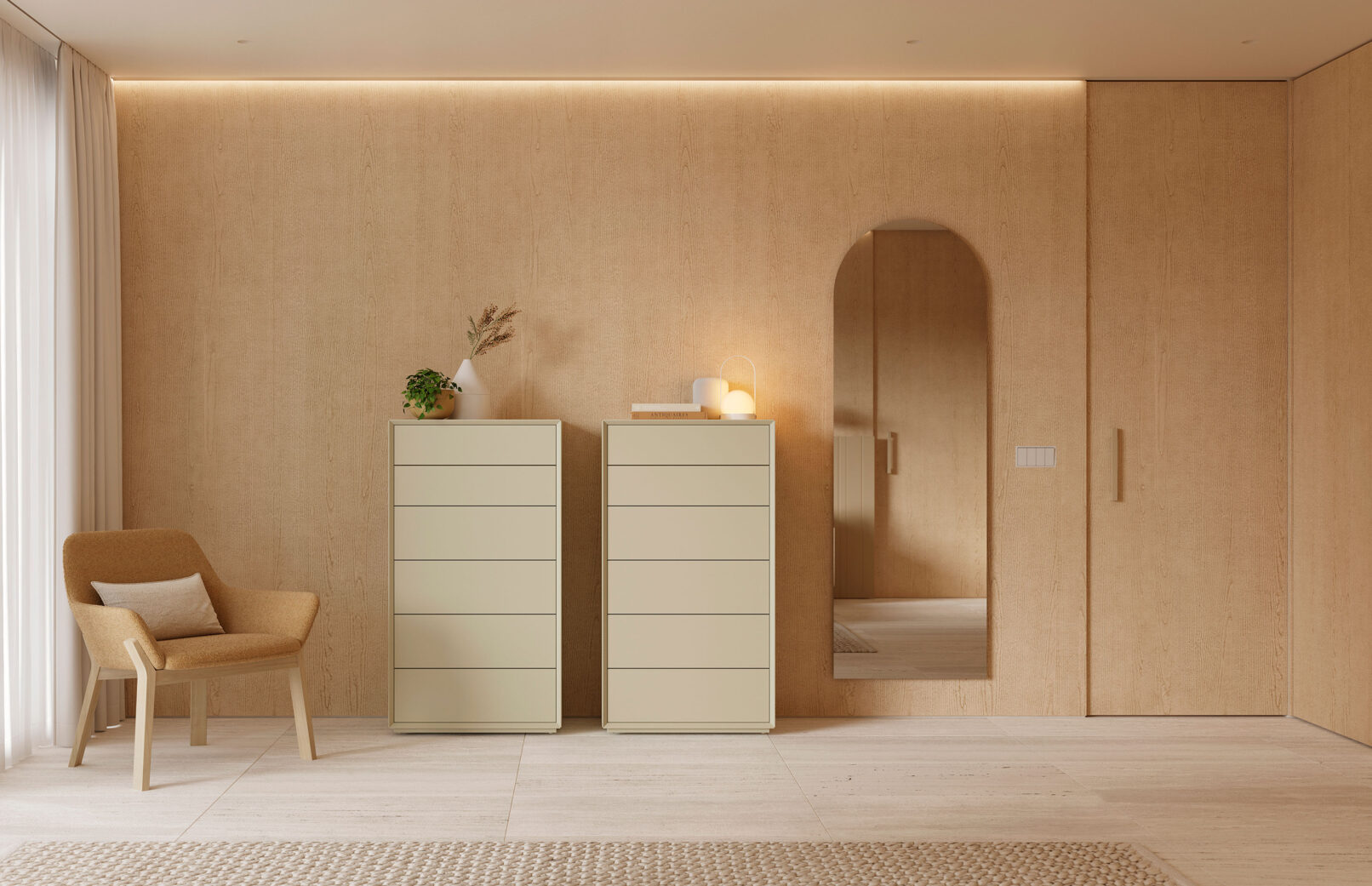 Programa de dormitorios de diseño, totalmente adaptables con acabados naturales, tacto madera. Amplio abanico de opciones de almacenaje debajo de la cama. Programa de mesillas cubo con muchas medidas a elegir. Los cabezales se fabrican a medida de largo y alto. Cajones con guías ocultas autofreno. Opción de iluminación led en los cabezales.