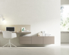 Ambiente de trabajo minimalista y práctico con muebles suspendidos en la pared a 2 alturas y en tonos suaves. Acabados: Trufa Mate y Lino Mate. Medidas: 300x44,1 cm Las zonas de trabajo actuales se definen por la integración orgánica y la multifuncionalidad, buscando que el mobiliario y la decoración no rompan la armonía del hogar, sino que la complementen.