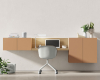 Módulos bajos de 2 puertas combinado con módulos diáfanos con estante. Sillón giratorio tapizado en polipiel negro.