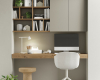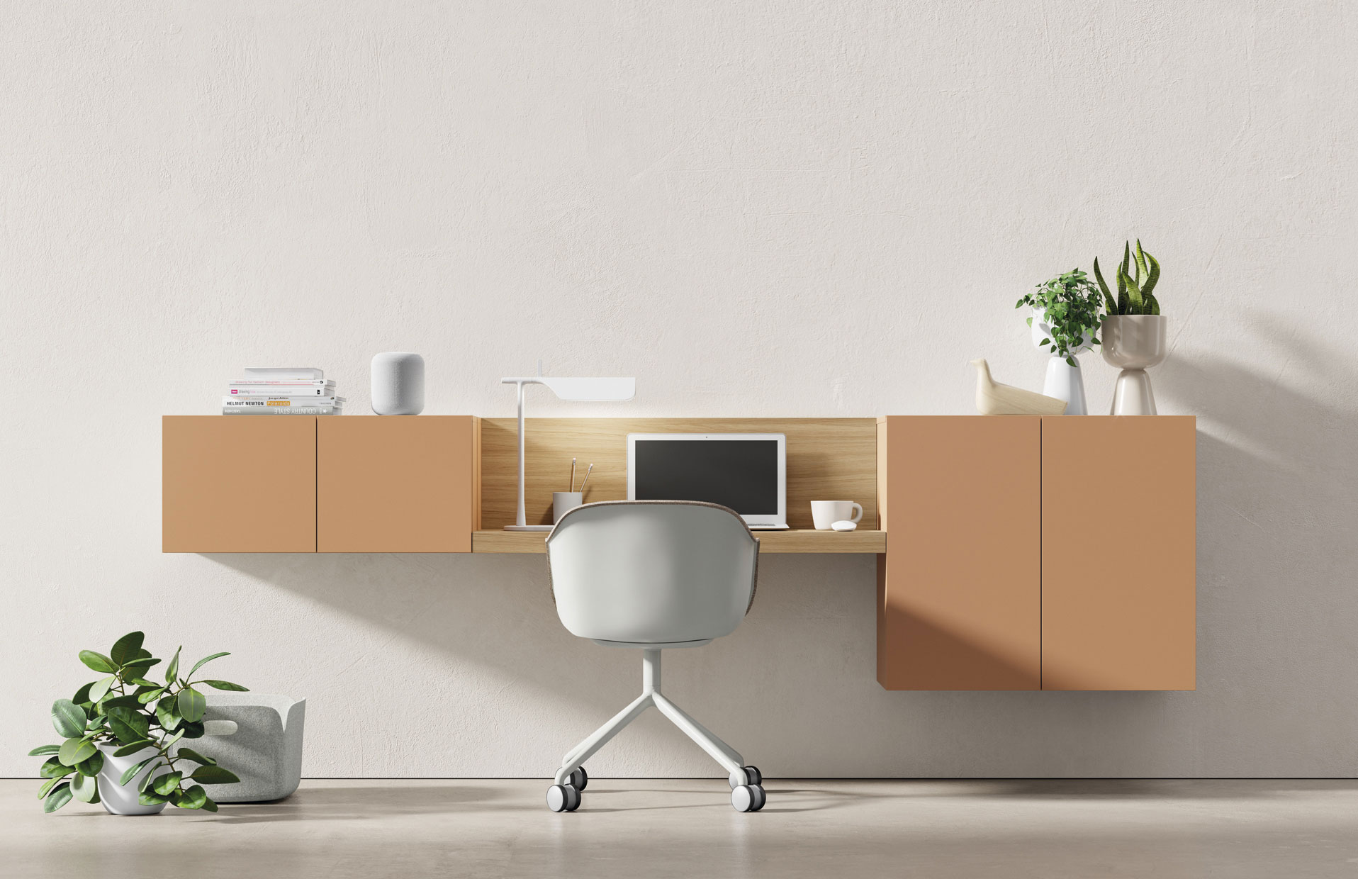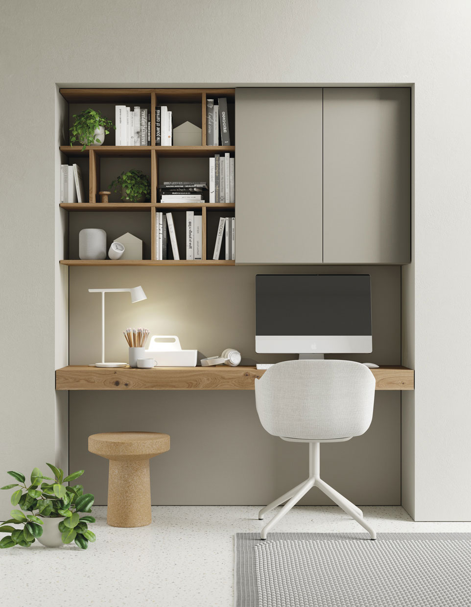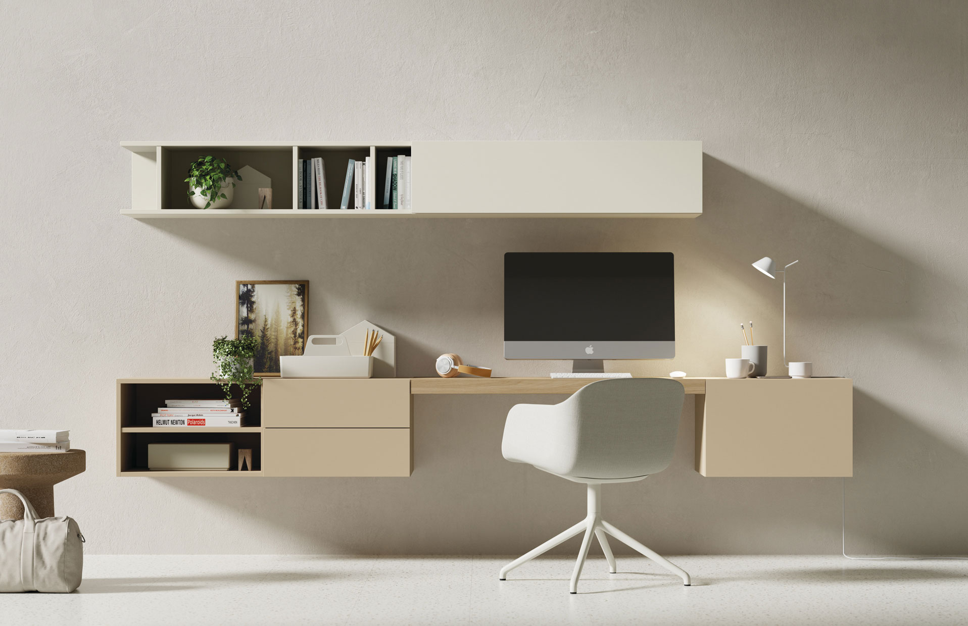 Ambiente de trabajo minimalista y práctico con muebles suspendidos en la pared a 2 alturas, estanterías superiiores y en tonos tiierra naturales. Acabados: Sésamo Mate, Roble 18 y Perla Mate. Medidas: 300x34,1/44,1 cm fondo. Las zonas de trabajo actuales se definen por la integración orgánica y la multifuncionalidad, buscando que el mobiliario y la decoración no rompan la armonía del hogar, sino que la complementen.