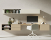 Ambiente de trabajo con capacidad de almacenaje, muebles colgados a pared en Roble natural y lacado intenso. Acabados: Duna Mate y Roble 18. Medidas: 300x44,1 cm. Las zonas de trabajo actuales se definen por la integración orgánica y la multifuncionalidad, buscando que el mobiliario y la decoración no rompan la armonía del hogar, sino que la complementen.