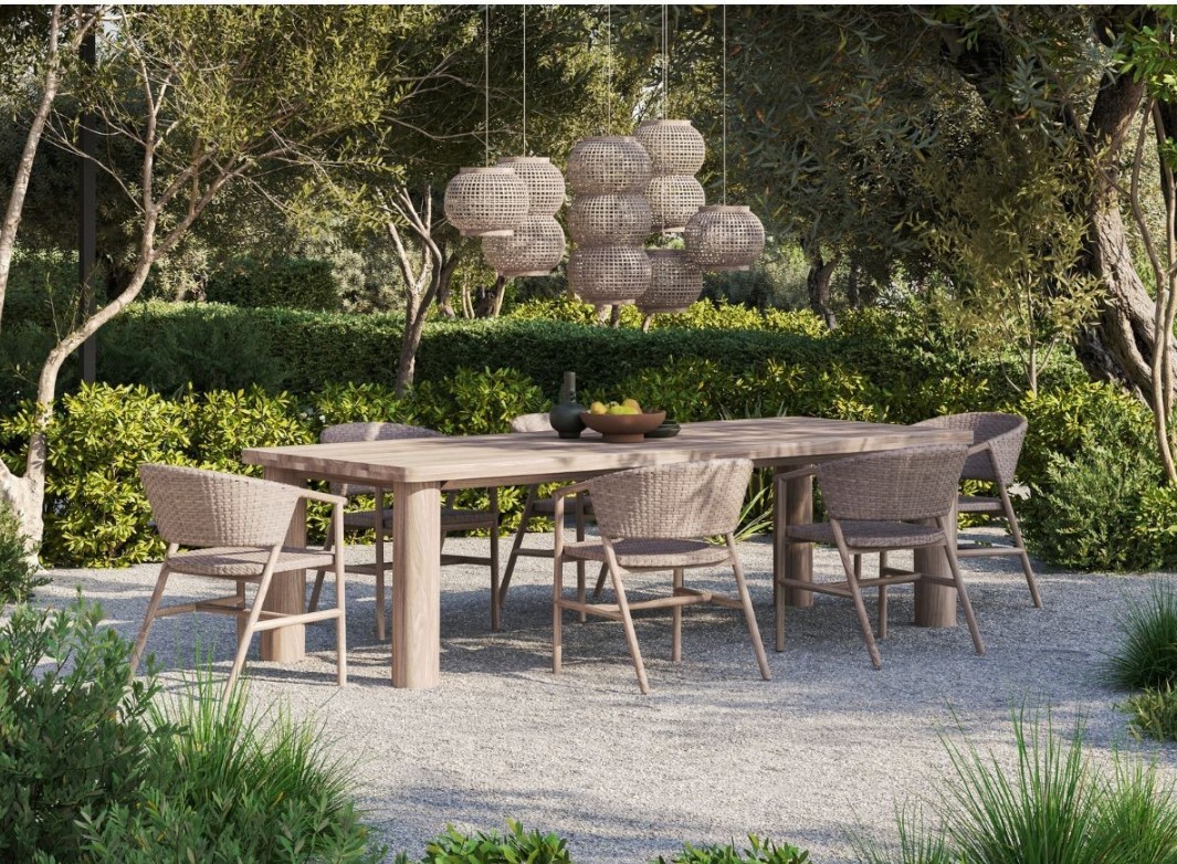 Mesa de comedor rectangular de para exterior de teca envejecida. Es apta para exterior. cuenta con patas en los extremos. El sobre hace efecto de listones de madera al dejar pequeñas separaciones entre sus tablas. Dimensiones: 240x100x76,5 cm Silla para exterior de cuerda sintética y madera de teka. Fabricada en madera de teka envejecida blanqueada y cuerda sintética en color camel es sillón de altura de comedor apto para uso en porches o jardines. Los brazos aportan comodidad al igual que la cuerda que lo hacen una pieza confortable. Combinalo con nuestras mesas en el mismo tono de teka, sillones, butacas o mesas de centro. Dimensiones: 62x60x75 cm