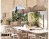 Ambiente exterior con sofás de madera de Mango de 1 9 4 x 9 0 x 7 0 c m-8 8 x 9 0 x 7 0 c m. Mesas de centro fabricadas con raíz natural de Teka Ø 6 0 x 4 0 c m. Muebles de madera que cuidan del planeta fabricados con maderas recuperadas. La naturaleza nunca se apresura. Átomo por átomo, poco a poco logra su trabajo. Materiales sostenibles que evocan a la satisfacción.