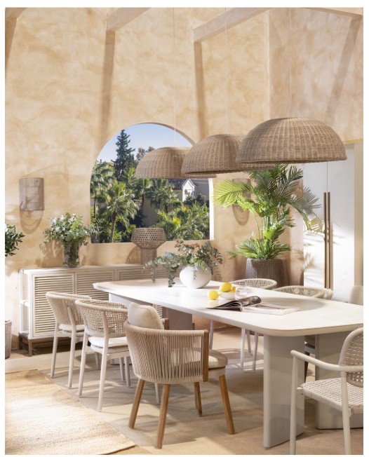 Ambiente comedor exterior con mesa de comedor de madera Suar de 2 5 0/3 0 0 x 1 1 0 x 7 5 c m. Lámpara fabricada con ramas de árbol de 5 5 x 5 5 x 6 0 c m. Sillones de rattan blanco y negro. Muebles de madera que cuidan del planeta fabricados con maderas recuperadas. La naturaleza nunca se apresura. Átomo por átomo, poco a poco logra su trabajo. Materiales sostenibles que evocan a la satisfacción.