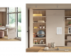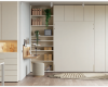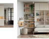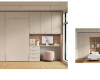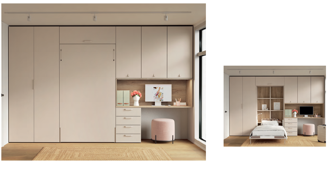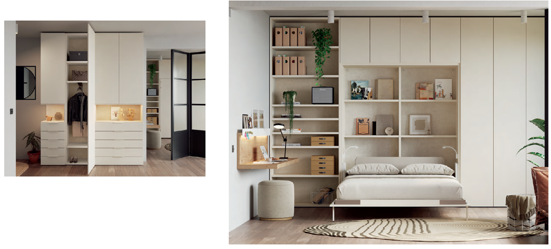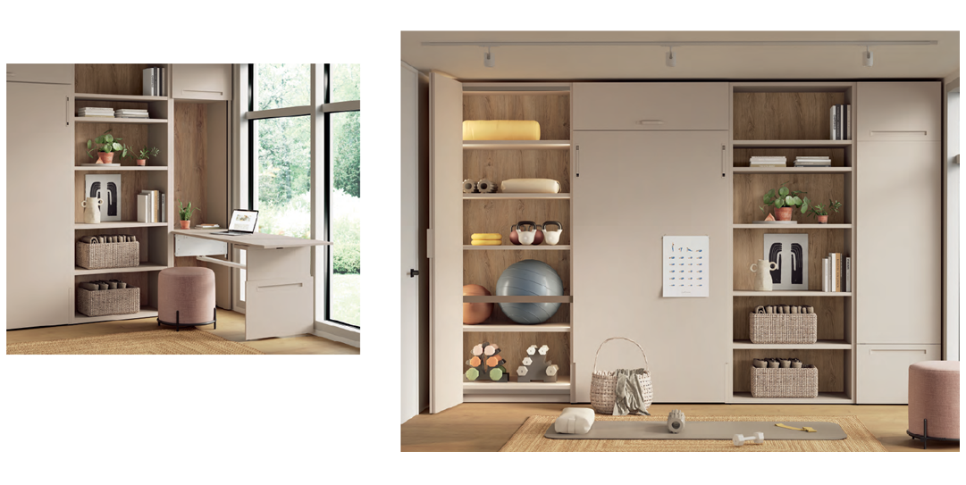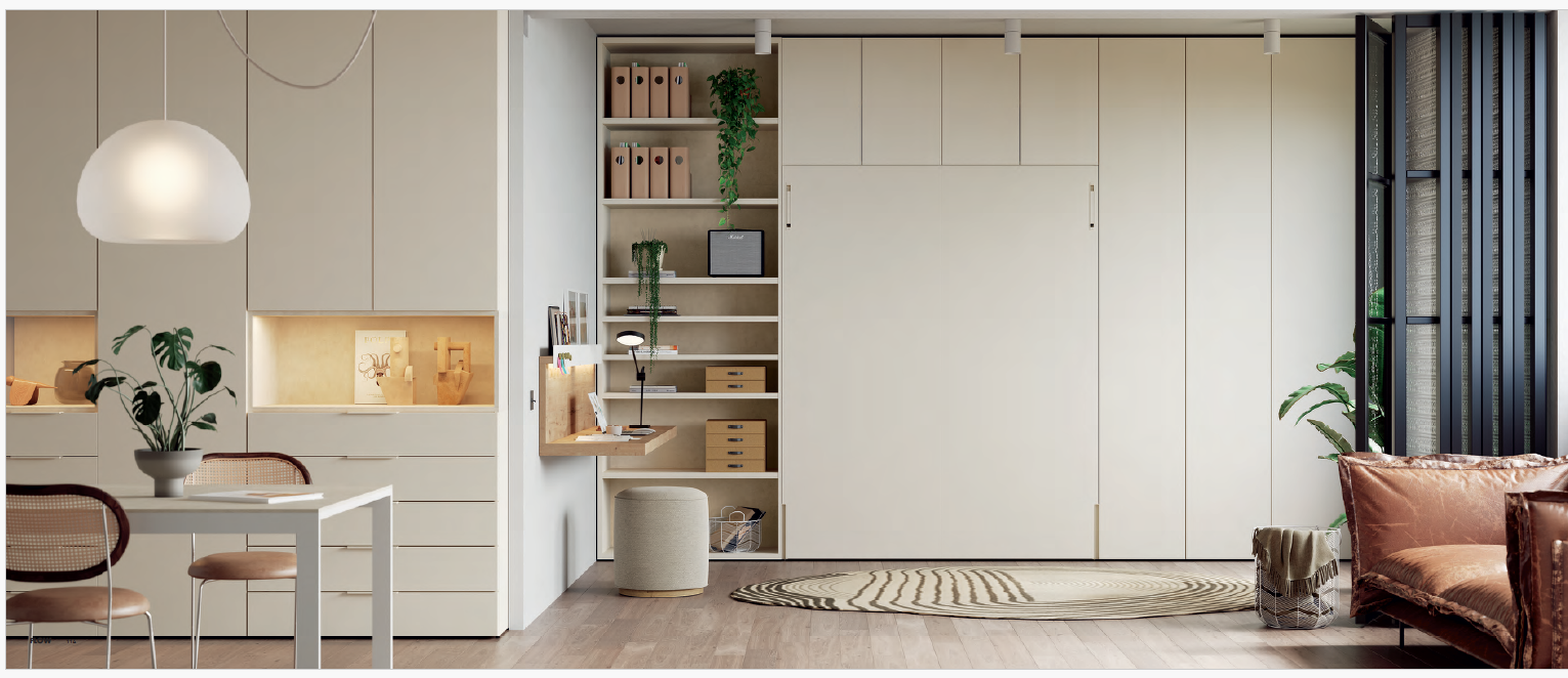 Ambientes compactos. Conjuntos multifuncionales creados para dar cabida a todas las actividades en un mismo entorno, ya sea descansar, guardar, almacenar o divertirse. Polivalencia al máximo Ambientes de gran versatilidad que se transforman según el uso que quieras darles. La mesa SCAM, por ejemplo, puede extenderse y retirarse según las necesidades.Medidas: 361x239 cm alto. Acabados: Maya, Arena.