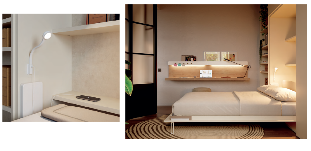 Todo en uno. Soluciones prácticas para espacios reducidos. En este proyecto de loft se busca generar un ambiente amplio y funcional durante el día, que resulte holgado y confortable por la noche. Medidas zona noche: 421x260 cm alto. Medidas zona día: 200x257 cm alto.Acabados: Forest, Ivory, Stone Bianco. Ideas con luz La iluminación nocturna, más allá de tener una finalidad práctica, está diseñada para dar un nuevo tono al entorno llenándolo de sensaciones plácidas y relajantes.