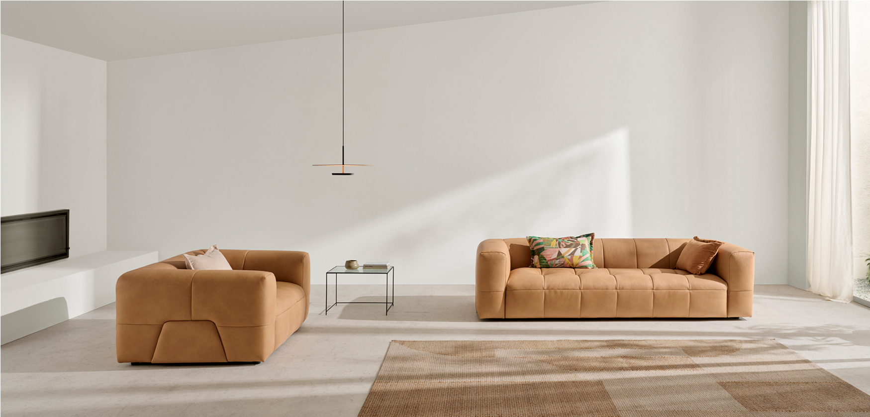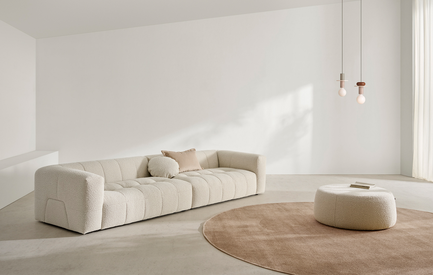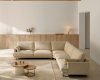 Programa de piezas basado en un único cojín de asiento que presenta un sutil capitoneado en tresbolillo. Dicho detalle le aporta una gran riqueza visual así como una solución para evitar que aparezcan arrugas en el propio cojín de asiento. Existe además una versión “extra-large” que proporciona 15 cm más de profundidad en los asientos y que puede ser combinada con la versión normal.