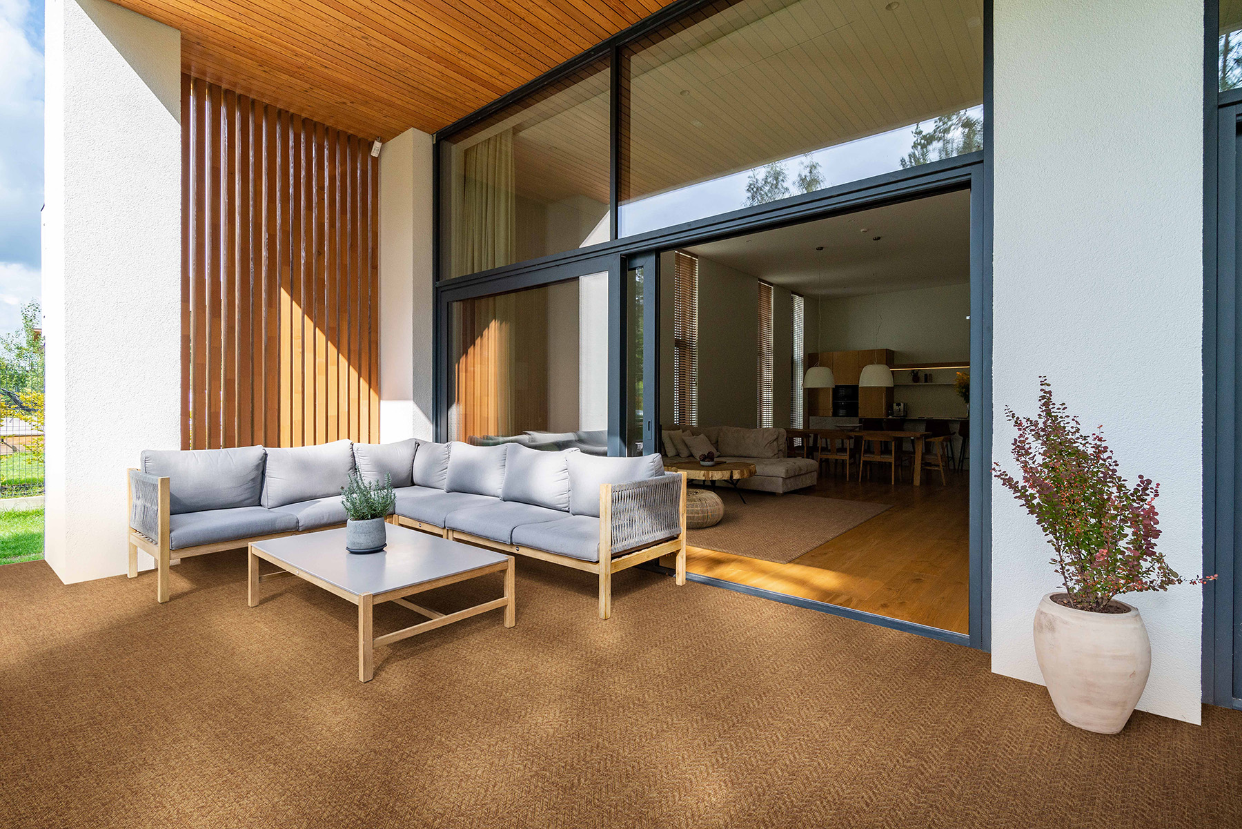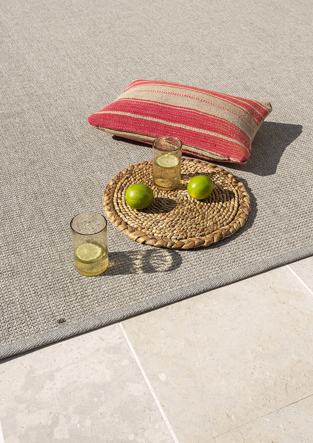 Las alfombras a medida o moquetas ALFRESKO son aptas también para exterior. Su aspecto es muy similar a las alfombras de fibras naturales y más concretamente a las alfombras de Sisal. Esta colección es resistente al agua y además a los efectos de la luz solar lo que aumenta enormemente las posibilidades a la hora de decorar terrazas, porches u otras zonas de exterior.